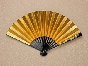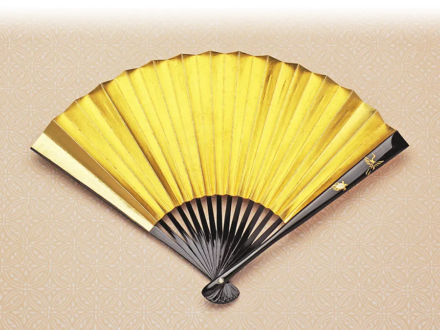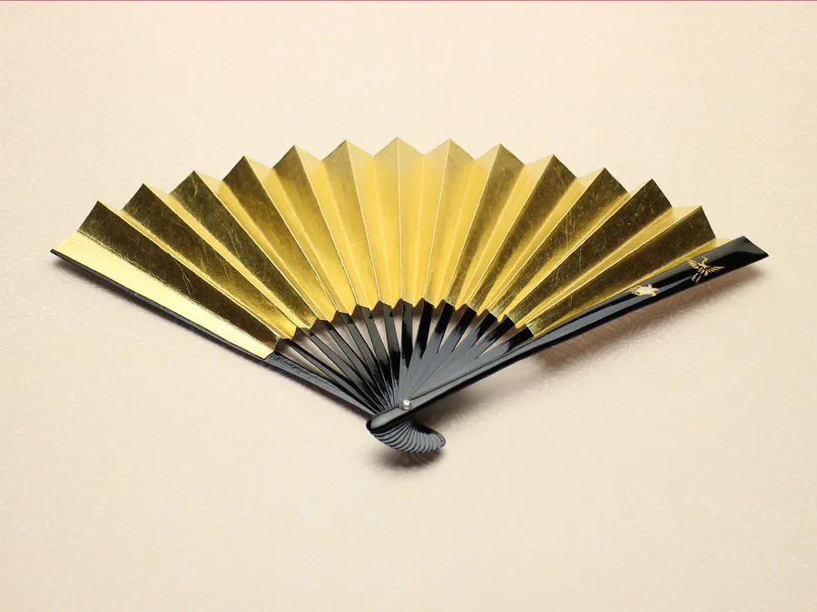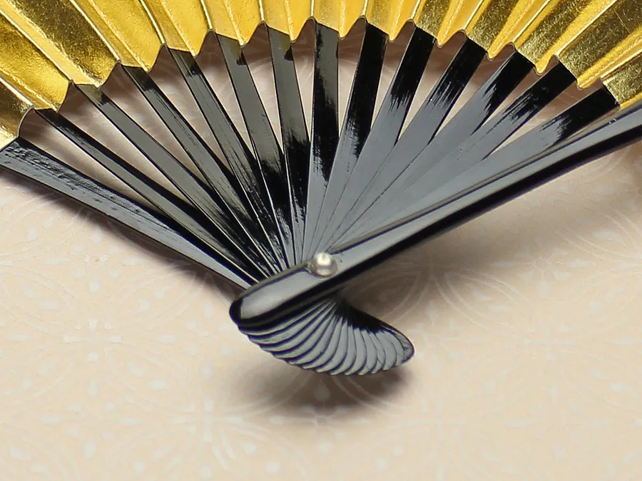 親骨に漆芸の技法の一つである蒔絵を施し、地紙は本銀箔で上品に仕上げています。 表は本銀箔に金色着色です。