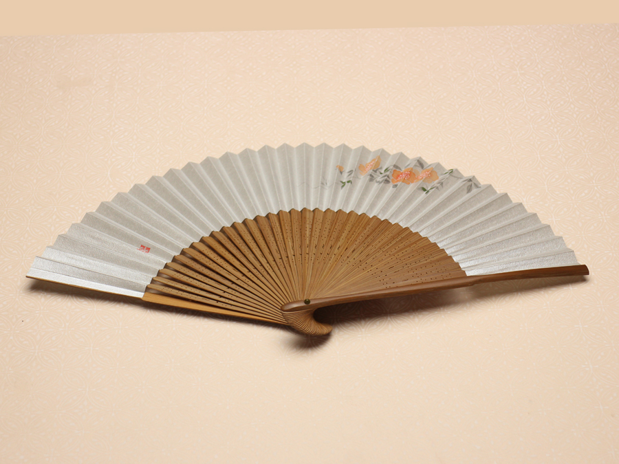 うすいグレーのパールの光沢のある地紙にぼかした色合いで、はまなすを描いています。
